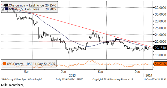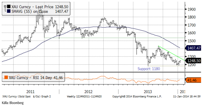 Non-Farm Payrolls (antal nyanställda) för december kom in förvånande lågt i fredags. FED hade nog inte räknat med att antalet nyanställda skulle hamna på halva den tidigare och den förväntade nivån när de inledde nedtrappningen av ökningen av penningmängden i december. Marknaden tolkade omedelbart siffran som att den fördröjer takten i ”tapering” processen och handlade ner dollarn – vilket allt annat lika innebär ett högre pris på guld (som ju handlas i dollar) och som dessutom gynnas av ”mer pengar” att parkera. Det är dock lite för förhastat att dra för långtgående slutsatser bara av en månads arbetsmarknadsstatistik.