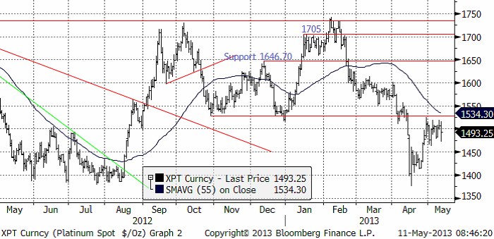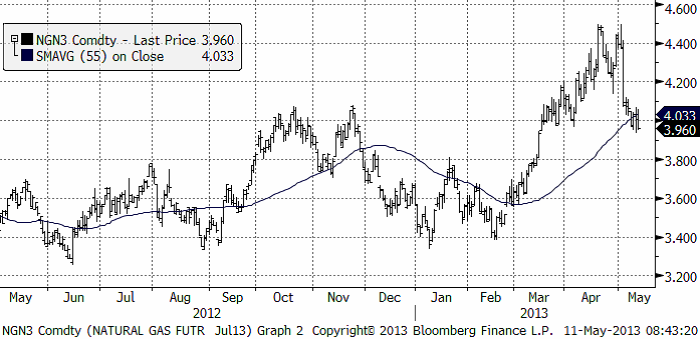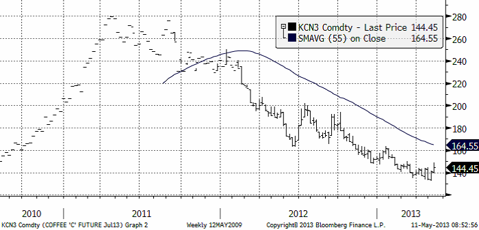 Kaffepriset (maj 2013) steg i veckan. Marknaden gjorde ett försök att bryta den övre delen i den trendkanal som priset fallit under i två år. Detta lyckades dock inte den här gången, men som jag har skrivit tidigare ser det ut att finnas köpare som är oroliga för att marknaden har bottnat. När det kommer tecken på styrka i marknaden, tenderar priset att sticka iväg uppåt. Än så länge har det funnits nog med säljare i de lägena för att trycka tillbaka priset, men när det inte längre gör det längre, tyder marknadens beteende på att det kan gå fort uppåt.