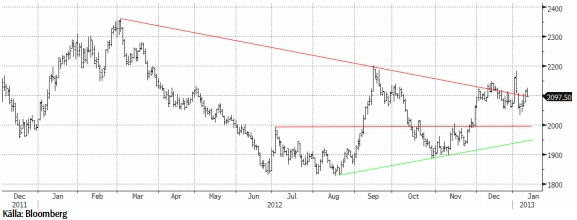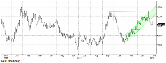 Veckan före jul rekommenderade vi att ta vinst kring motståndet vid 2150. Priset bröt ur kanalen och tillfälligtvis upp till ca2190 under årets första handelsdag. Vinsthemtagningarna har varit kraftiga och i kombination med omviktningen av råvaruindex (se ovan) blev pressen stor. Ur ett tekniskt perspektiv bör man stå vid sidlinjen för tillfället. Vi tror emellertid på en större potential på 2-3 månaders sikt på nivåer upp mot $2400.