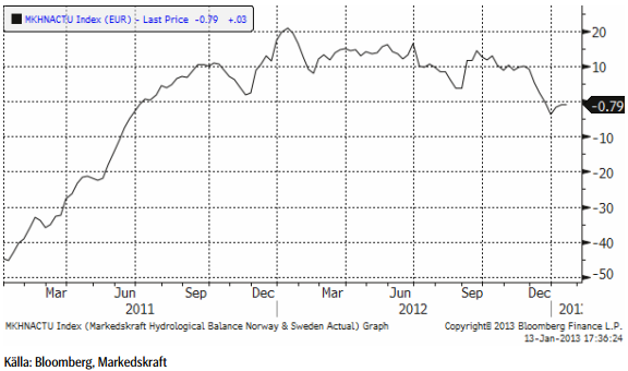 December och januari är de månader när vattenkraftverken producerar mest elektricitet, men vi kan se skillnaden på utvecklingen i år jämfört med årsskiftet mellan år 2011 och 2012, när den hydrologiska balansen ökade.