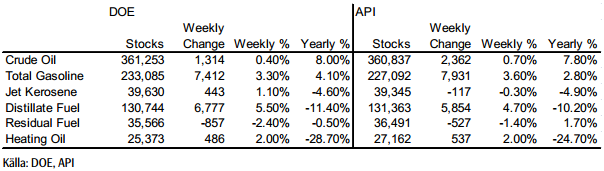 Nedan ser vi den veckovisa lagerstatistiken från USA. Den visade på en ökning av råoljelagren i linje med förväntningarna, men en ökning av bensin och destillatlagren som var större än väntat.