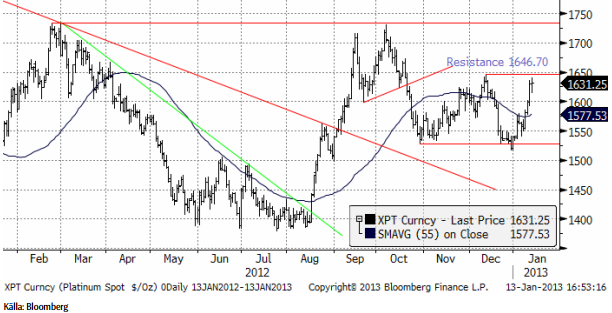 Platina, vår favorit bland de tre ädelmetallerna, har gått upp rejält i veckan som gick. Marknaden testar nu en kortsiktig motståndsnivå på 1646.70. Bryts den, är det fritt upp till 1730 dollar.