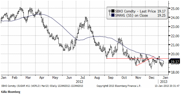 Sockerpriset (mars 2013) vände upp förra veckan efter att rekylen nedåt blev förvånande liten när priset vände på 18.52 som lägst. Det ser ut som om marknaden håller på att konsolidera sig, liksom för kaffemarknaden ovan. I två månader har priserna inte varit i fallande trend längre, utan rört sig sidledes. Det är vanligt att detta föregår en trendvändning. Vi förbereder oss därför på att gå över från neutral rekommendation till köprekommendation. Den som vill gå lång socker köper certifikatet SOCKER S.