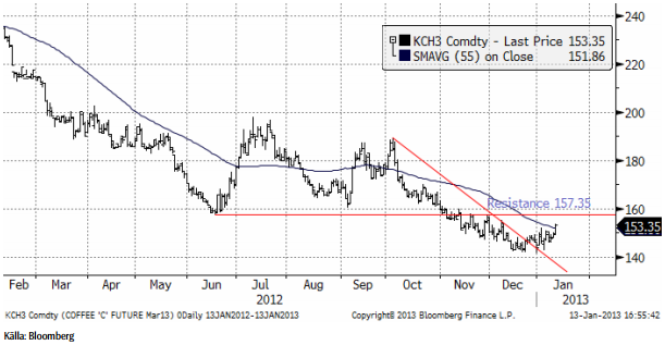 Kaffepriset (mars 2013) tycks ha etablerat en botten, åtminstone för den här nedgångscykeln. Priset bröt 55-dagars glidande medelvärde i fredags, under gott momentum. En ovanligt stor skörd i Brasilien har fått priset på kaffe att falla med 35% det senaste året. Kaffe är en ”vartannat-års-gröda”. Enligt Conab kan årets skörd överträffa förra årens rekord. Enligt Conab kommer skörden att uppgå till 50.83 miljoner säckar. År 2012 skördades 43.5 miljoner säckar och året innan 48 miljoner. En säck väger 60 kg. Skörden sker i april. Av skörden väntas 37.5 miljoner säckar vara av arabica-sorten och 12.7 miljoner säckar vara av robusta-sorten.