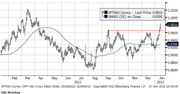 Nedan ser vi priset på platina i termer av guld, eller ”växelkursen” mellan XPT och XAU, valutakoderna för de två ädelmetallerna. Vi ser att platina har passerat en viss motståndsnivå i relationen. Platina har nu mindre än 2% kvar till att handlas på par till guld. Platina har historiskt varit dyrare än guld. Det har varit det ”normala” och situationen kan vara på väg att ”normaliseras” igen.
