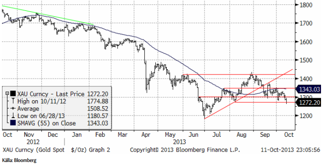 Guldpriset föll med 3% i veckan och stängde precis på ett det sista tekniska stödet på nedsidan innan priset faller till 1200 dollar. Tekniskt ser det ut som om marknaden kommer att handla ner till 1200 dollar igen och det finns inga garantier för att priset på guld inte går ännu lägre. Andra råvarumarknader som haft ett överkott i produktionen sedan årsskiftet 2010/2011, när konjunkturen vände ner och produktionen av råvaror kom ikapp efterfrågetakten, har vänt upp när nu konjunkturen vänt uppåt igen och de låga priserna fått producenter att dra ner. Detta har inte hänt i guldmarknaden. Guldproducenter har alltid förefallit mer övertygade om just deras råvaras förestående hausse än andra råvaruproducenter har gjort. Jag känner inte till någon guldproducent som kastat in handduken på grund av kostnader, om vi bortser från bristfälligt finansierade prospekteringsbolag. De flesta tolkar en förestående lösning på budgetkrisen i USA som negativt för guldet, dvs som en minskad takt i skuldökningen i USA; en förlust för den sittande presidenten. Detta har påverkat guldmarknaden negativt. Medan Kinas inflation, enligt Kinas statistiska centralbyrå, är 2.6%, är verkligheten av råvaruprisboomen där förmodligen betydligt högre, men Kinas guldköp dominerar inte över USA:s. Kinas ekonomi är än så länge ungefär lika kraftfull som Italiens. Italienarna är i och för sig oroliga för en skatt på sparande. IMF kom i veckan ut med en rapport som föreslår en skatt på 10% av eurozonens medborgares sparande som en metod att lösa skuldkrisen. Det är en metod som Italien använde sig av för att lösa skuldkrisen efter valutakrisen i början av 1990-talet. Det naturliga för de flesta är dock att ta ut pengarna från bankkontot, inte att köpa guld.