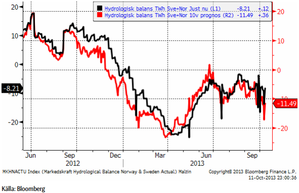 Markedskrafts prognos för hydrologisk balans, har fallit till -11.49 TWh för 10-veckorsprognosen.