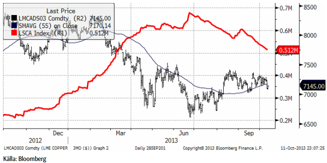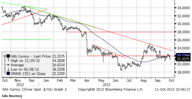 Platinapriset stängde i fredags på ett teniskt stöd. Det har varit en solid nedgång sedan månadsskiftet augusti-september och det marknaden är i behov av en uppgång, men om guldmarknaden faller igenom sitt stöd, bör även platina fall ner mot 1300 dollar. Priset står just nu och väger. Jag tror mer på en nedgång. Om priset går över 1400 dollar har vi däremot en köpsignal, enligt teknisk analys.