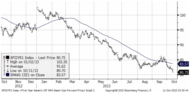 Årskontraktet på energikol har dock fallit till en ny bottennotering på 80.75 dollar per ton.