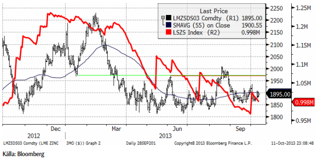 Folk gick till LME-veckan med en baissig inställning till aluminium, men åkte nog hem något mindre negativa. I mitten av förra veckan visade en del analytiker ett mindre överskott (produktion > konsumtion) än tidigare och Alcoa publicerade sin kvartalsrapport i onsdags – som skrev om ett kommande underskott! Även om folk anser detta som tämligen osannolikt, räckte bränslet för en prisuppgång. Efter uppgången mot 1890 i fredags börjar marknaden se lite dyr ut istället. Det finns trots allt ett överskott och Kina investerar just nu i ny kapacitet istället för att dra ner. Alcoa behöll sin prognos på en stadig efterfrågeökning om 7% per år, vilket är i linje med, men något högt, jämfört med de flesta analytikers prognoser. Så länge utbudet ökar mindre än efterfrågan kommer det att ske en långsam, men stadig förbättring av den grundläggande balansen, men fortfarande finns det stora lager som måste betas av.