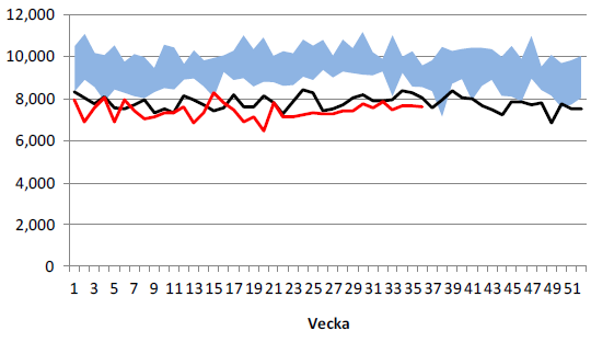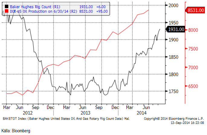 Nedan ser vi ett diagram på antalet oljeriggar i USA, enligt Baker Hughes statistik (svart) och USA:s oljeproduktion enligt US DOE på 8.357 mbpd. Antalet borr-riggar steg i veckan från 1925 till 1931.