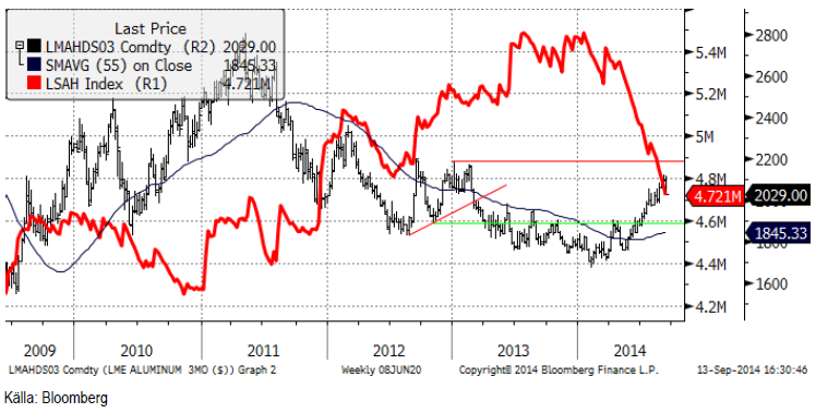 Vi tror att aluminiummarknaden kommer att röra sig ”sidledes” ett tag. Den branta uppåtgående pristrenden är bruten. Vi tycker att det är rimligt att det sker eftersom marknaden har varit något ”överhettad”. Den mest troliga utvecklingen är att priset nu fluktuerar inom intervallet 2000 – 2150 dollar. Det finns en möjlighet att utbudet ökar som svar på de lite högre priserna och det begränsar uppsidan. Å andra sidan är efterfrågan på aluminium relativt stark och borde bli ännu starkare när vi kommer in i det fjärde kvartalet, så nersidan borde vara begränsad i priset. Taktiskt, talar det för en strategi där man försöker köpa på nedgångar (mot 2000 dollar) och sälja på uppgångar (mot 2150).