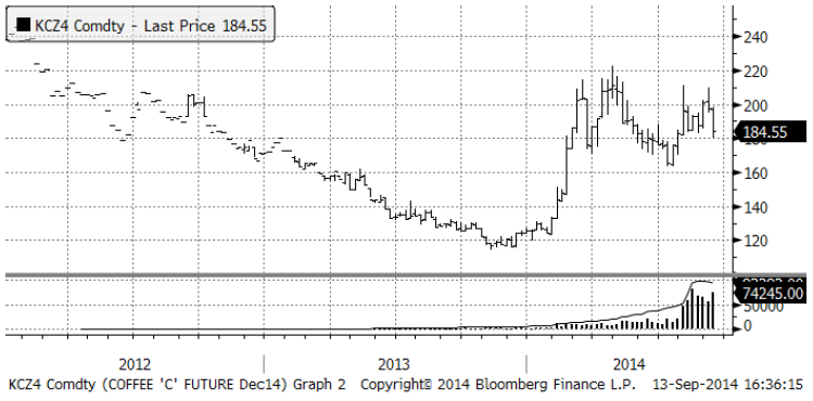 Regn över Minas Gerais gav prisfall på kaffet. 180 cent är ett visst tekniskt stöd. Vi ser väl inte någon trigger åt något håll. Sidledes rörelse tror vi kommer att fortsätta.