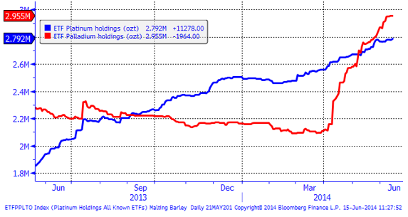 Nedanför ser vi hur mycket metall som finns i börshandlade fonder för platina respektive palladium. Ingen av kurvorna har vänt ner pga slutet på strejken. Vi har tidigare sett hur innehaven ökat vid prisnedgång och minskat vid prisuppgång.