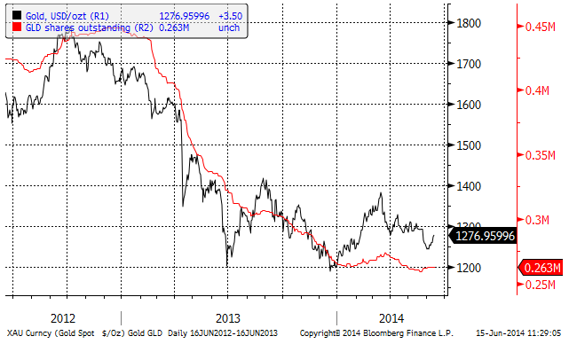Det har inte varit vare sig inflöden eller utflöden ur den största guld-ETF:en ”GLD” den senaste tiden.