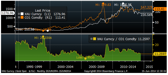 Guldet är förhållandevis billigt i ett historiskt perspektiv om man jämför med oljan. Nedan ser vi några års historik och kvoten mellan de två.