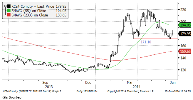 Vi går nu över till att följa utvecklingen i decemberkontraktet för arabica i New York, KCZ4. Vi gick över till neutral rekommendation förra veckan och fortsätter med det. Det tekniska stödet vid 171.10 (i decemberkontraktet) ser ut att hålla, men uppgången därifrån som marknaden försökte med i senare delen av veckan, stötte omedelbart på säljare och marknaden stängde nära dagslägsta i fredags.
