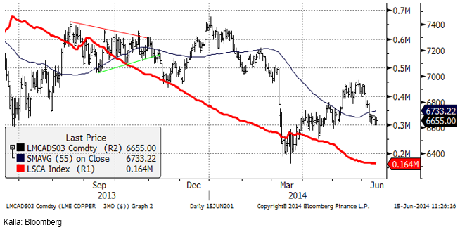 Importstatistiken för maj i Kina var svagare än i april. I maj importerades 380 kt jämfört med 450 kt i april. Ett annat tecken på svagare efterfrågan i Kina är att den fysiska premien för metall i Shanghai sjönk från 125 dollar till 69 dollar. Det är den lägsta nivån på 15 månader. Ett annat tecken på en svagare marknad är att backwardation mellan cash och 3-månader gått från 100 dollar till 20 dollar.