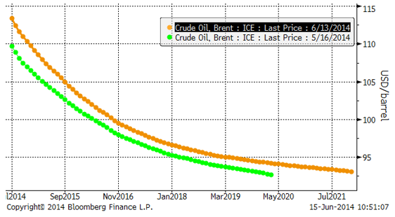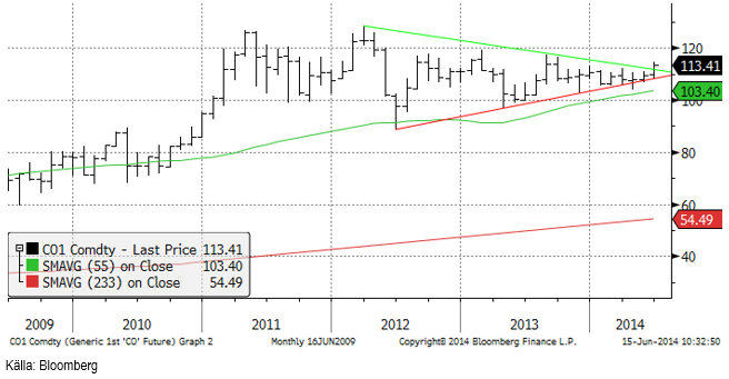 Oljemarknaden går nu in i vad som verkar vara en ny fas. Produktionspotentialen i Libyen är omöjlig att nå, då produktionen är lamslagen av islamistiska, sunnimuslimska, rebeller. Oljeproduktionen i Irak är allvarligt hotad av sunnimuslimska styrkor. I värsta fall skulle en betydande del av den oljeproduktion som världen räknat med, utebli. Risken är definitivt på uppsidan, även om en ”deal” mellan USA och Iran skulle kunna öka exporten av olja från Iran.