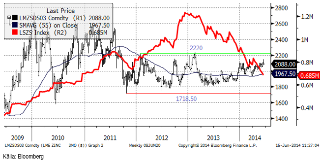 Tekniskt balanserar zinkpriset på trendlinjen stöd. Ett brott av den, som idag ligger vid ca 2080 dollar, skulle kunna utlösa kortsiktigt säljintresse.