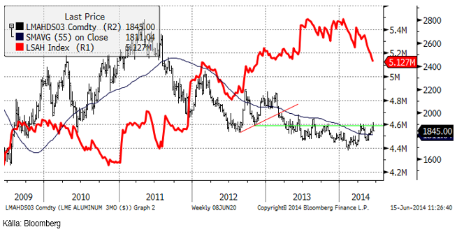 Rusal meddelade under veckan att de väntar sig ett underskott på 1.2 miljoner ton. Detta följdes upp av den oberoende konsultfirman Harbor Intelligence, som angav ungefär samma underskott. Detta innebär förstås att lagren minskar med ungefär samma mängd metall. Med 5 miljoner ton i lager på LME och kanske lika mycket i billigare lagerlokaler, kommer det att ta många år för marknaden att nå en situation där det råder brist på aluminium. Men detta kan trots det inträffa då och då innan dess, eftersom det mesta av metallen är uppbundet i finansieringsaffärer med olika lång löptid.