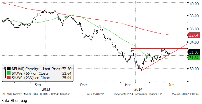 Fjärde kvartalets terminskontrakt på elektricitet har ännu inte lämnat konsolideringsfasen. I fredags steg priset initialt, men vände sedan ner och stängde under öppningskursen. Detta brukar inte vara positivt och vi får se om prisfallet fortsätter genom det tekniska stödet vid ca 32.30 på måndag. Om detta sker i veckan som kommer, finns nästa stöd på ca 31 euro. Det är lite torrare i prognoserna, men kärnkraften kommer nu återigen ”online” efter underhållen. Den finska kraften är tillbaka, medan det är lite förseningar med de svenska verken (som vanligt).