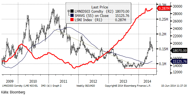 Nickelpriset bröt sig ur konsolideringen genom att falla. Det innebär att vi kortsiktigt vill ha en kort position, i t ex BEAR NICKEL X4 S.