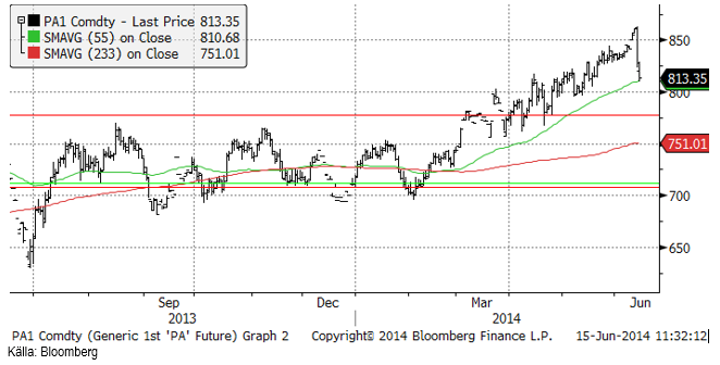 Prisdiagrammet på palladium ser vi nedan. Priset föll kraftigt med 5% i torsdags. Prisfallet fortsatte fram till stängning i fredags. Tekniskt stöd finns vid 800 dollar.