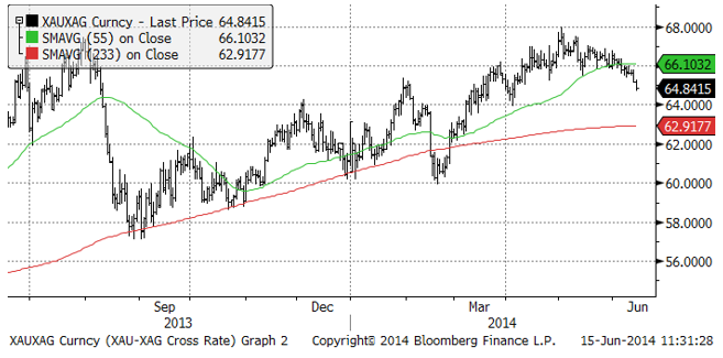 Nedan ser vi ett diagram över priset på guld uttryckt i silver. Silver, som är billigt i förhållande till guld, har vunnit mark i förhållande till guldet. Vi tycker dock fortfarande att silver är mer köpvärt än guld.