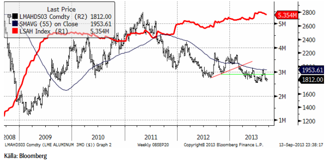Förra veckan noterade en marginell prisnedgång som stannade på 1812 dollar per ton. Stöd finns vid 1800 dollar. Går priset under den nivån skulle vi vilja vara korta, dvs köpta BEAR ALU X4 S.