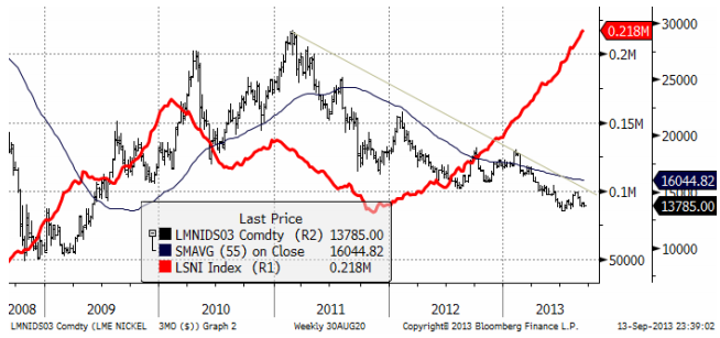 Nickelpriset följde den generella tendensen under veckan och stängde på veckans lägsta nivå, där priset balanserar på det tekniska stödet 13675 dollar per ton. Marknaden förväntar sig en återhämtning av fysisk efterfrågan under årets sista kvartal, huvudsakligen drivet av Kina. Produktionen av rostfritt stål steg med 11% i Kina under det första halvåret i år, huvudsakligen från 300-serien, som innehåller 8 – 10% nickel, enligt CRU. Efter en långsammare takt under det tredje kvartalet, tror CRU på en återhämtning under det fjärde. Det skulle innebära en ökning av efterfrågan på 13% i årstakt. Med det stora lager som finns skulle detta verkligen behövas för att få marknaden i balans. En faktor som skulle kunna leda till ökad efterfrågan är den premie för nickel i nickel pig iron vi nämnde i förra veckans brev. Att vi ser att cancellerade warrants (lagerbevis) vid LME nu uppgår till 20% av LME:s lager, kan vara ett tecken på ökad efterfrågan på primärnickel. Nya ”cancellations” rapporteras från Malaysia, där allt nickel i lager har levererats in från Kina. Det är nu möjligt att det här lagret går tillbaka till Kina. Det finns alltså några tecken på förbättringar i marknadsläget, men nickel har förmodligen en lång väg att gå innan vi ser en rejäl återhämtning.