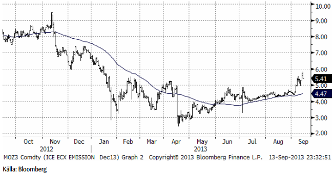 Nedan ser vi terminspriset för månaden, på energikol i Rotterdam. Vi ser att marknaden har vänt uppåt. Trenden är bruten. Detta har indirekt, men helt säkert, en påverkan på prisnivån på nordisk elektricitet. Vi väntar oss en fortsatt återhämtning i kolpriset åtminstone upp till 95 dollar per ton. Och därmed motsvarande prisuppgång på nordisk elektricitet. Dessutom tror vi på en procentuellt sett väsentligt högre prisuppgång på utsläppsrätter.