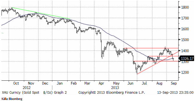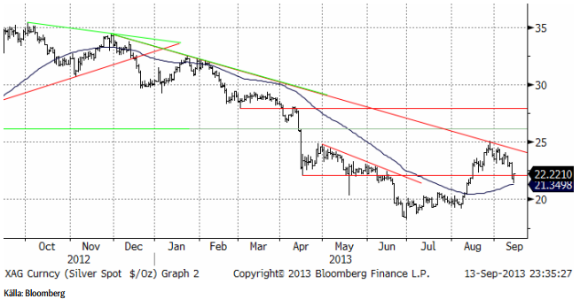 Oljepriset föll tillbaka när det gick upp för alla – även de som inte läst det här veckobrevet – att USA inte skulle eskalera konflikten med Syrien. Som vi skrev för redan två veckor sedan var det uppenbart att USA:s president inte skulle fullfölja sitt hot. Syrienkonflikten skulle kunna ha påverkat producerande länder, så att oljepriset påverkats, men det finns även andra faktorer som faktiskt har en påverkan på oljepriset och som fått verka i det tysta. Libyens produktion har haft problem och efterfrågan har fått skjuts av den ekonomiska återhämtningen som sker i hela världen. Oljepriset befinner sig i en positiv trend rent tekniskt. Priset har gott stöd vid 110 dollar per fat, men motstånd vid 118 dollar ungefär. Fortfarande handlas oljepriset inom det prisintervall som varit rådande sedan tre år tillbaka.