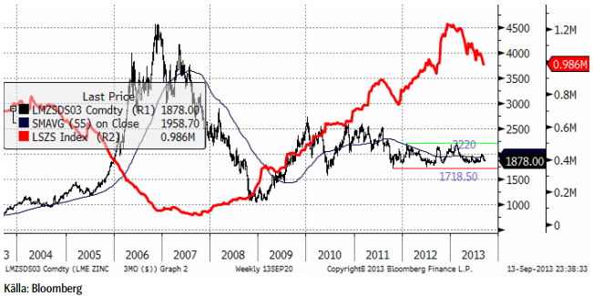 Den senaste ILZG-rapporten indikerar dock att det finns en starkare efterfrågan och att balansen förbättras, vilket gör ett aluminium-scenario mindre sannolikt. Stöd finns vid 1850 dollar per ton, som vi tror att marknaden håller sig över.
