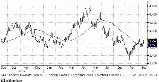 Naturgaspriset studsade på 3.60 i veckan och stängde i fredags på 3.75. Tekniskt motstånd ligger på 3.80.