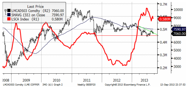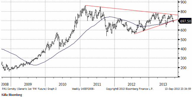 Oljepriset föll tillbaka när det gick upp för alla – även de som inte läst det här veckobrevet – att USA inte skulle eskalera konflikten med Syrien. Som vi skrev för redan två veckor sedan var det uppenbart att USA:s president inte skulle fullfölja sitt hot. Syrienkonflikten skulle kunna ha påverkat producerande länder, så att oljepriset påverkats, men det finns även andra faktorer som faktiskt har en påverkan på oljepriset och som fått verka i det tysta. Libyens produktion har haft problem och efterfrågan har fått skjuts av den ekonomiska återhämtningen som sker i hela världen. Oljepriset befinner sig i en positiv trend rent tekniskt. Priset har gott stöd vid 110 dollar per fat, men motstånd vid 118 dollar ungefär. Fortfarande handlas oljepriset inom det prisintervall som varit rådande sedan tre år tillbaka.