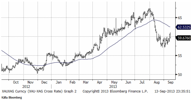 Nedan ser vi kvoten mellan guldpriset och silverpriset.