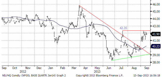 Tekniskt har motståndet vid 41.35 hållit stånd. Det är inte otänkbart att blötare väder och kärnkraftverk som kommer igång, kan få priset att rekylera ner från fredagens stängningspris på 41.90 euro per MWh. En sådan rekyl betraktar vi som ett utmärkt köptillfälle.