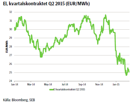 Sedan senaste elkommentaren (två veckor sedan) har marknaden fallit ytterligare. Större delen av fallet var i början av perioden, därefter har det egentligen mest varit sidledes. I stort är fundamental input oförändrad. Spotpriset följer temperaturen och ”svarar” bra med stigande pris så snart temperaturen faller nedåt. Någon långvarig vinterkyla syns däremot inte i prognoserna och för varje dag som passerar minskar risken för ”price spikes”. Den korta änden av kurvan är fortsatt mest påverkad av den i huvudsak milda vintern och god tillgång på snömagasin. Längre ut på kurvan (som inte våra certifikat replikerar) har däremot handlat högre under en period med stöd av högre kontinentala elpriser. Elmarknaden i Tyskland har drivits upp på högre konsumtion som stigit på både bättre industriförbrukning och, under en period, även av kallare väder i Centraleuropa. Dessutom har både kol- och CO2 priser samt US-dollar stärkts. Terminen som SEB:s certifikat följer, Q215, stängde igår på 25,15 euro/MWh