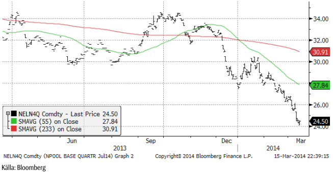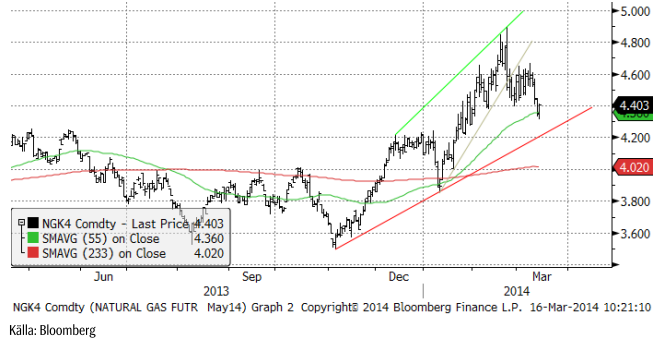 Förra veckan rekommenderade vi köp av BEAR NATGAS X4 S mot bakgrund av att priset stigit en längre tid på det kalla vädret i USA och att varmt väder nu ”borde” komma in i prognosfönstret. Samtidigt såg vi att antalet borr-riggar återigen ökar tydligt och de flesta av dem producerar gas. Japan drar igång sina kärnkraftverk nu och slutar därmed att importera LNG. Det har talats om, bland annat i en annons i New York Times i fredags som en privatperson (!) satt in med anledning av krisen i Ukraina, att EU skulle importera LNG från USA. Om det sker, som en del i det ”paket” som EU och USA ställer upp mot Ryssland efter söndagens ”val” i södra Ukraina, kan det verka stödjande på priset, men annars bör priset i första hand falla ner mot 4.30 – 4.20 dollar per MMBtu. Vi fortsätter med säljrekommendation och behåller BEAR NATGAS X4 S.