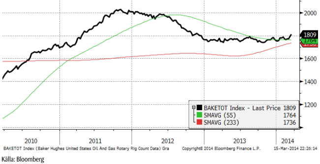 Antalet borr-riggar i USA steg i veckan till 1809 (förra veckan 1792) stycken enligt Baker Hughes. Det är återigen en ökning och bekräftar den trend vi skrev om förra veckan. Skifferboomen i USA har fått ny fart och kommer att resultera i en ännu högre produktionsökning i USA.