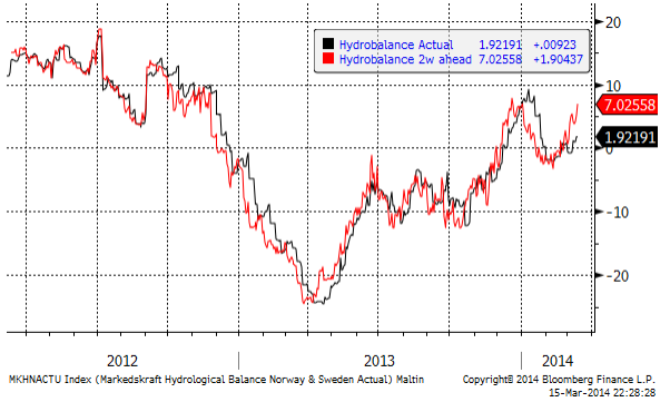 2 veckors prognos för hydrologisk balans har stigit till +7 TWh (förra veckan +5 TWh).
