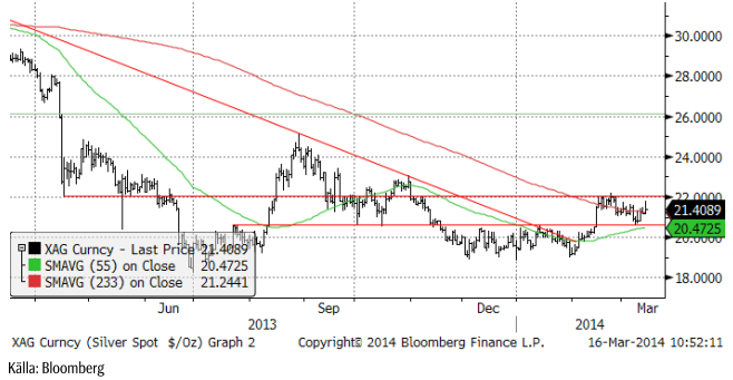 I takt med att tillväxten tvekar såväl i Kina som i USA leder det till ökade förväntningar på monetär stimulans i Kina och mindre avtrappning av den monetära stimulansen i USA. Sådana uttalanden har också kommit från FED, bland annat att takten på ”tapering” kan diskuteras. Konflikten mellan Ryssland och Ukraina och EU:s och USA:s kostnader för att handskas med detta bidrar också till att ge stöd till guldpriset. Oron för en extrem upptrappning av konflikten, även om den har liten sannolikhet påverkar också guldpriset positivt. Guldpriset är känsligt för ändringar i sannolikheten för extrema händelser av den karaktären.