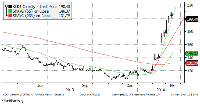 Tekniskt noterar vi att priset har brutit stödet för den allra mest intensiva uppgången, vilket signalerar en förestående rekyl. Tekniskt stöd finns i första hand på ca 180 cent.