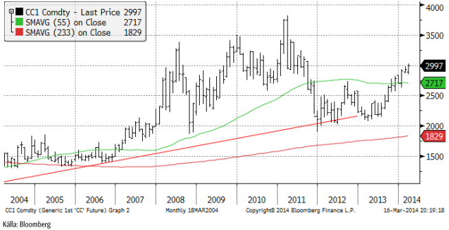 Priset på kakao i New York har gått upp från 2709 dollar per ton till 2997 sedan årsskiftet, alltså plus 10%. Uppgången är framförallt driven av en stark efterfrågan. Som vi ser i diagrammet nedan är priset på kakao återigen uppe vid 3000 dollar per ton, som är den nivå som priserna pendlade kring vid slutet av 00-talets råvaruboom åren 2009 – 2011. Det är möjligt att priset kan gå högre, men uppgångens momentum bör mattas av på de nuvarande höga nivåerna.