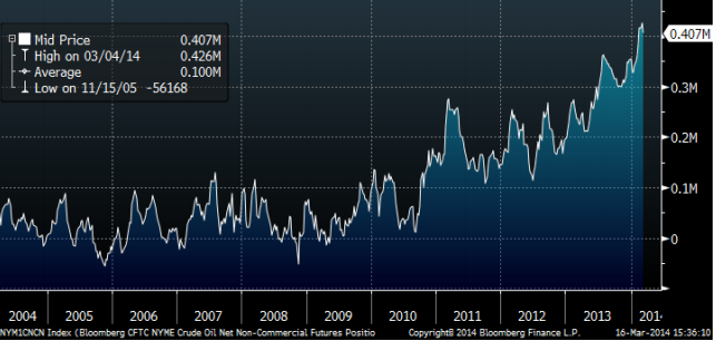 Non-commercials (investerare) är rekordköpta terminskontrakt på NYMEX i New York, enligt CFTC:s rapport i fredags. De äger terminskontrakt för 407 miljoner fat olja. År 2010 var de nästan inte köpta olja alls. Tänk om sentimentet ändrar sig!!!