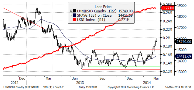 Nickel har till skillnad från de andra basmetallerna stigit i veckan. Som vi skrivit tidigare gynnas nickelpriset av oron för Rysslands/Ukraina-krisen. Priset har dock kommit upp till 16,000 dollar och det är en motståndsnivå, där t ex marknaden fann en botten i slutet av år 2012. Vi rekommenderar därför att man går ur långa positioner nu och lägger sig neutral.