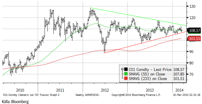 Oljepriset sjönk under lugn handel i veckan från 109 till 108.57 dollar per fat. Vi tror att det är lugnet före stormen, när oljepriset bryter stödet i den stora triangelformation som marknaden handlar inom.