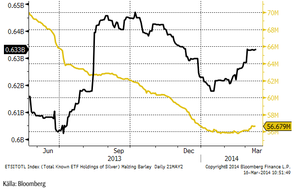 Nu har institutionella placerare börjat köpa guldfonder igen! Den gula kurvan visar antal miljoner uns som ägs via börshandlade fonder/certifikat/depåbevis. Innehaven i silver, den svarta kurvan, har ökat kraftigt sedan början av året, men förblivit oförändrad den senaste tiden.
