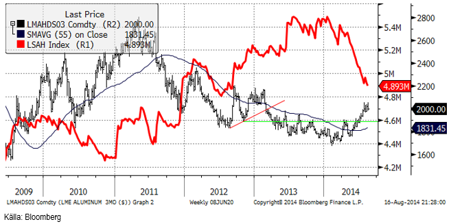 Som man kunde vänta sig, ledde det överköpta läget till en rekyl i aluminiumpriset. Den utlösande händelsen var uppenbarligen onsdagens kinesiska statistik. Efter att ha testat den tidigare toppnoteringen på strax över 2050 dollar, blev aluminium rätt påsåld under resten av veckan. Ur en teknisk synvinkel utgör fredagens stängning utanför trendkanalen en signal om ett fall ner till juli månads lägsta vid 1970 dollar. Trots likvideringen i veckan som gick, håller aluminium emot bättre än resten av basmetallerna. Det kan hända att marknaden oroar sig för möjliga störningar i den ryska exporten om sanktionskriget fortsätter att eskalera. Ryssland exporterar 80% av sin produktion på 3.7 miljoner ton.